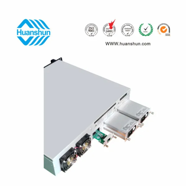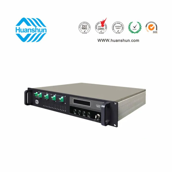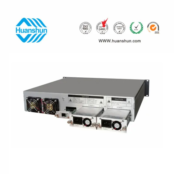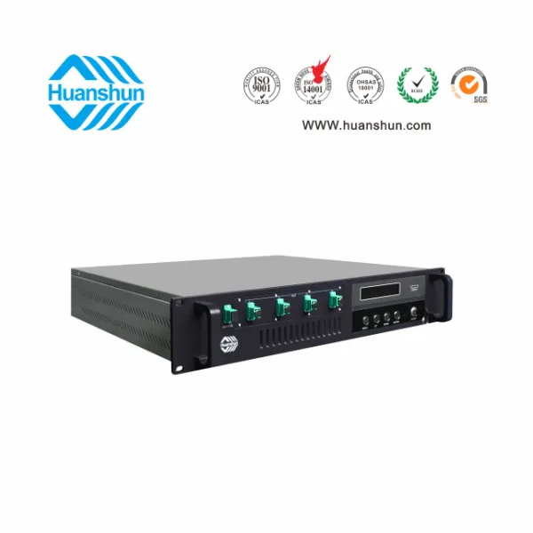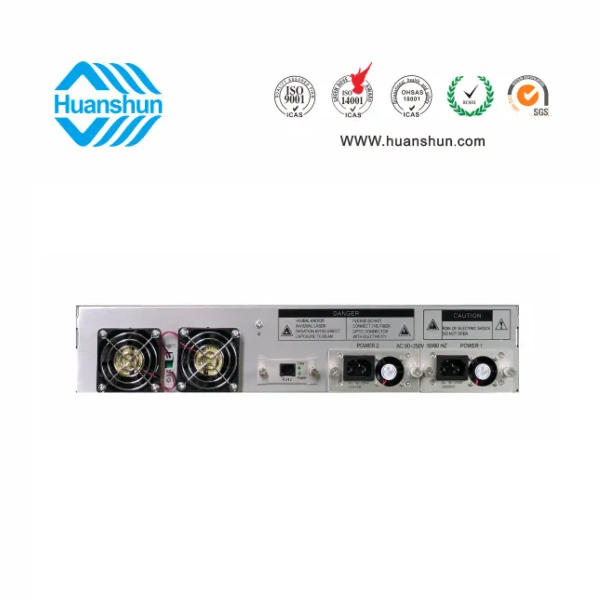 19 " 2U標準機箱,-5 ~ +10 d Bm輸入,4路標稱規格(16、17、18、19、20、21、22、23、24dBm)放大輸出,并支持下調-2dB,安全連接模式,NF ≤ 5dB(0dBm時);內置FWDM合波器,插播損耗 ≤ 1dB;雙模塊熱插撥電源,AC90 ~ 255V或DC-48V供電,RJ45標準網管(支持SNMP、WEB)